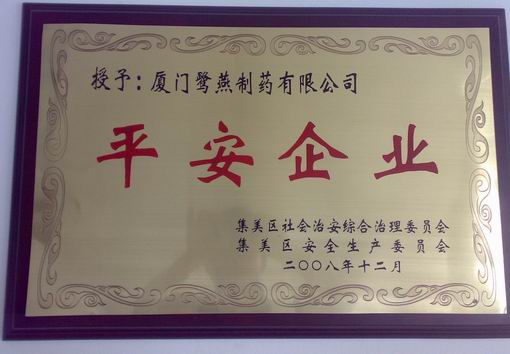 近日,集美區召開了“2008年度平安企業”表彰大會,廈門鷺燕制藥有限公司從幾百家參評企業中脫穎而出,獲此殊榮。
