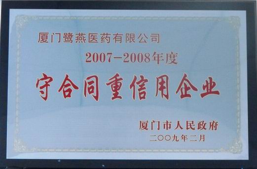 近日,廈門鷺燕醫(yī)藥有限公司、廈門鷺燕大藥房有限公司在廈門市工商行政管理局組織的 “廈門市2007—2008年度‘守合同,重信用’”評比活動中榜上有名,這是鷺燕集團(tuán)旗下子公司繼05-06年度之后再次獲此殊榮。