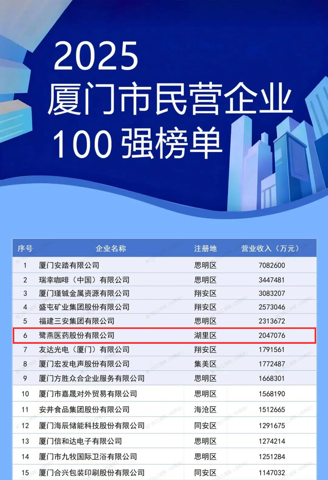 11月1日上午,2025年廈門企業(yè)家日大會召開。大會發(fā)布了2025廈門市民營企業(yè)100強(qiáng)系列榜單,介紹了廈門市民營經(jīng)濟(jì)發(fā)展態(tài)勢和營商環(huán)境建設(shè)成效。鷺燕醫(yī)藥股份有限公司憑借上市企業(yè)綜合實(shí)力,榮膺“2025廈門市民營企業(yè)100強(qiáng)”第6位,以及“2025廈門市民營企業(yè)服務(wù)業(yè)50強(qiáng)”第4位。